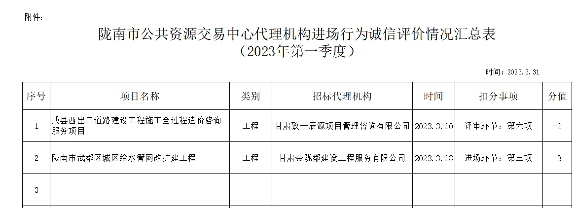 根據(jù)《甘肅省公共資源交易代理機構管理辦法》(甘政辦發(fā)〔2019〕107號)和《隴南市公共資源交易中心代理機構進場行為誠信評價實施制度(試行)》規(guī)定,現(xiàn)對2023年第一季度,共2家代理機構2條進場行為誠信評價記錄予以通報(詳見附表)。請各代理機構嚴格遵守各項規(guī)章制度、誠實守信,規(guī)范操作,為招標人和采購人提供專業(yè)、高效、規(guī)范的招標代理服務。