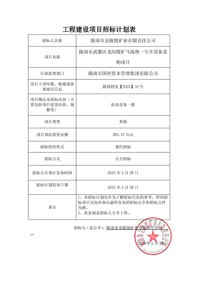 隴南市武都區(qū)龍溝煤礦馬池壩一號井設備采購項目