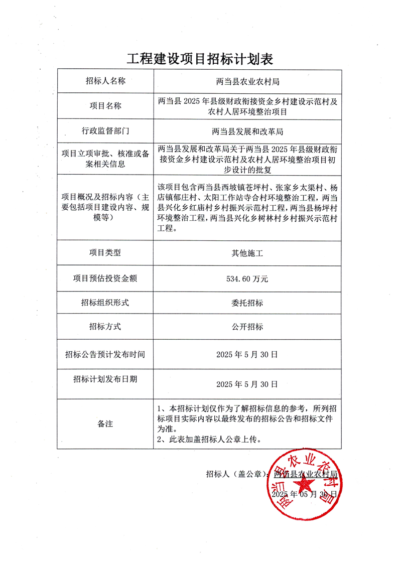 招標計劃表兩當縣2025年縣級財政銜接資金鄉(xiāng)村建設示范村及農村人居環(huán)境整治項目.pdf