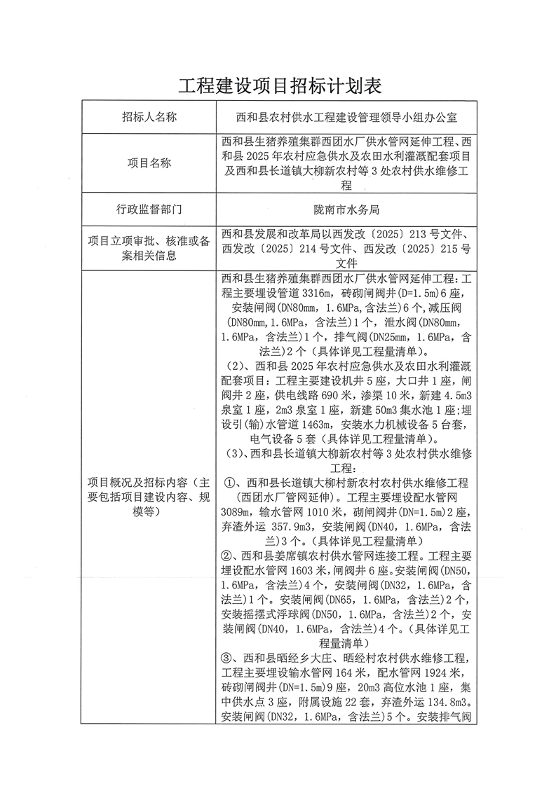 西和縣生豬養(yǎng)殖集群西團水廠供水管網延伸工程、 西和縣2025年農村應急供水及農田水利灌溉配套項目及西和縣長道鎮(zhèn)大柳新農村等3處農村供水維修工程