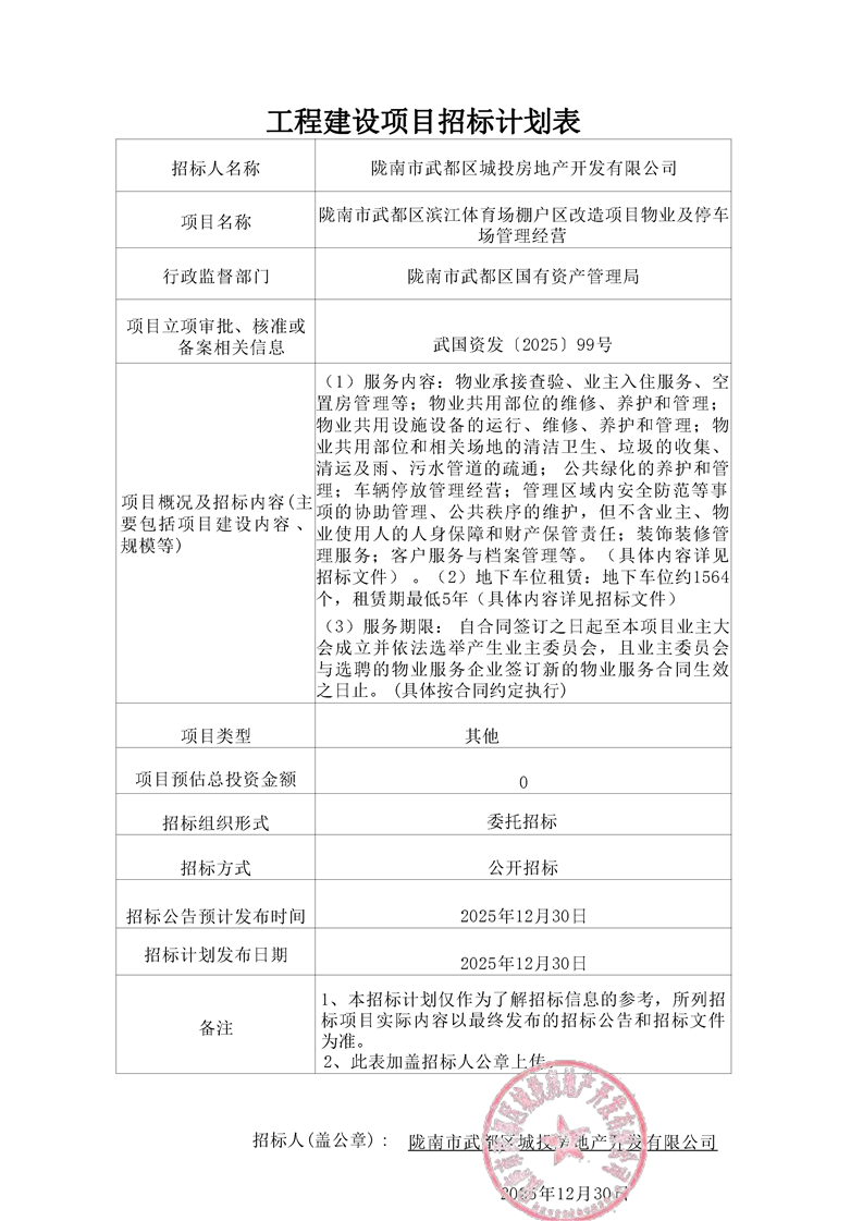 隴南市武都區(qū)濱江體育場棚戶區(qū)改造項目物業(yè)及停車場管理經(jīng)營