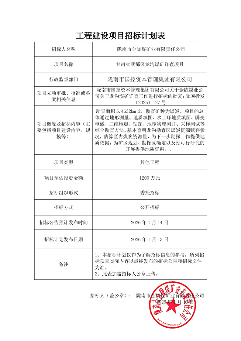 甘肅省武都區(qū)龍溝煤礦詳查項目