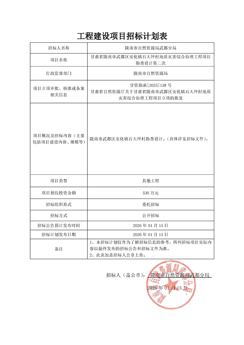 甘肅省隴南市武都區(qū)安化鎮(zhèn)石大坪村地質(zhì)災(zāi)害綜合治理工程項(xiàng)目勘查設(shè)計(jì)第二次