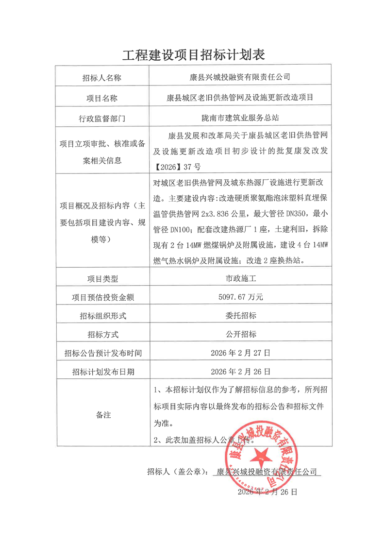 康縣城區(qū)老舊供熱管網(wǎng)及設(shè)施更新改造項(xiàng)目